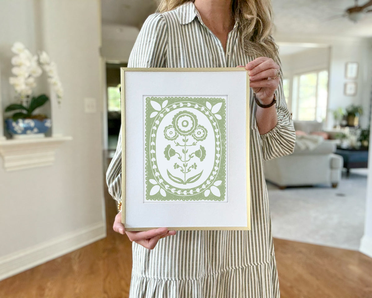 Bring timeless charm and modern minimalism to your walls with this bold green-and-white daffodil design. Originally hand-carved and stamped as a traditional block print, the artwork is now professionally reproduced as a fine-art giclée print—archival inks on thick, museum-quality paper—for rich pigments and crisp detail that last a lifetime.