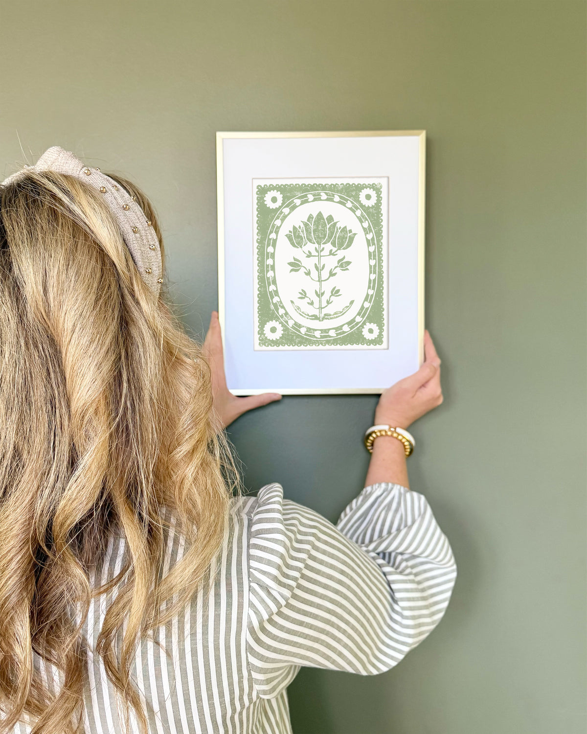 Bring timeless charm and modern minimalism to your walls with this bold green-and-white anemone design. Originally hand-carved and stamped as a traditional block print, the artwork is now professionally reproduced as a fine-art giclée print—archival inks on thick, museum-quality paper—for rich blacks and crisp detail that last a lifetime.