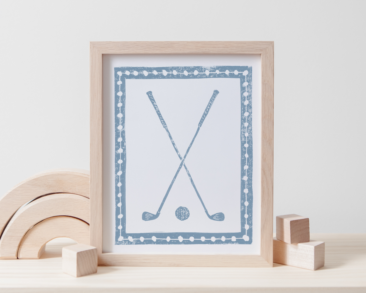 Bring timeless charm and modern minimalism to your walls with this bold blue and white golf club design. Originally hand-carved and stamped as a traditional block print, the artwork is now professionally reproduced as a fine-art giclée print—archival inks on thick, museum-quality paper—for rich pigments and crisp detail that last a lifetime.